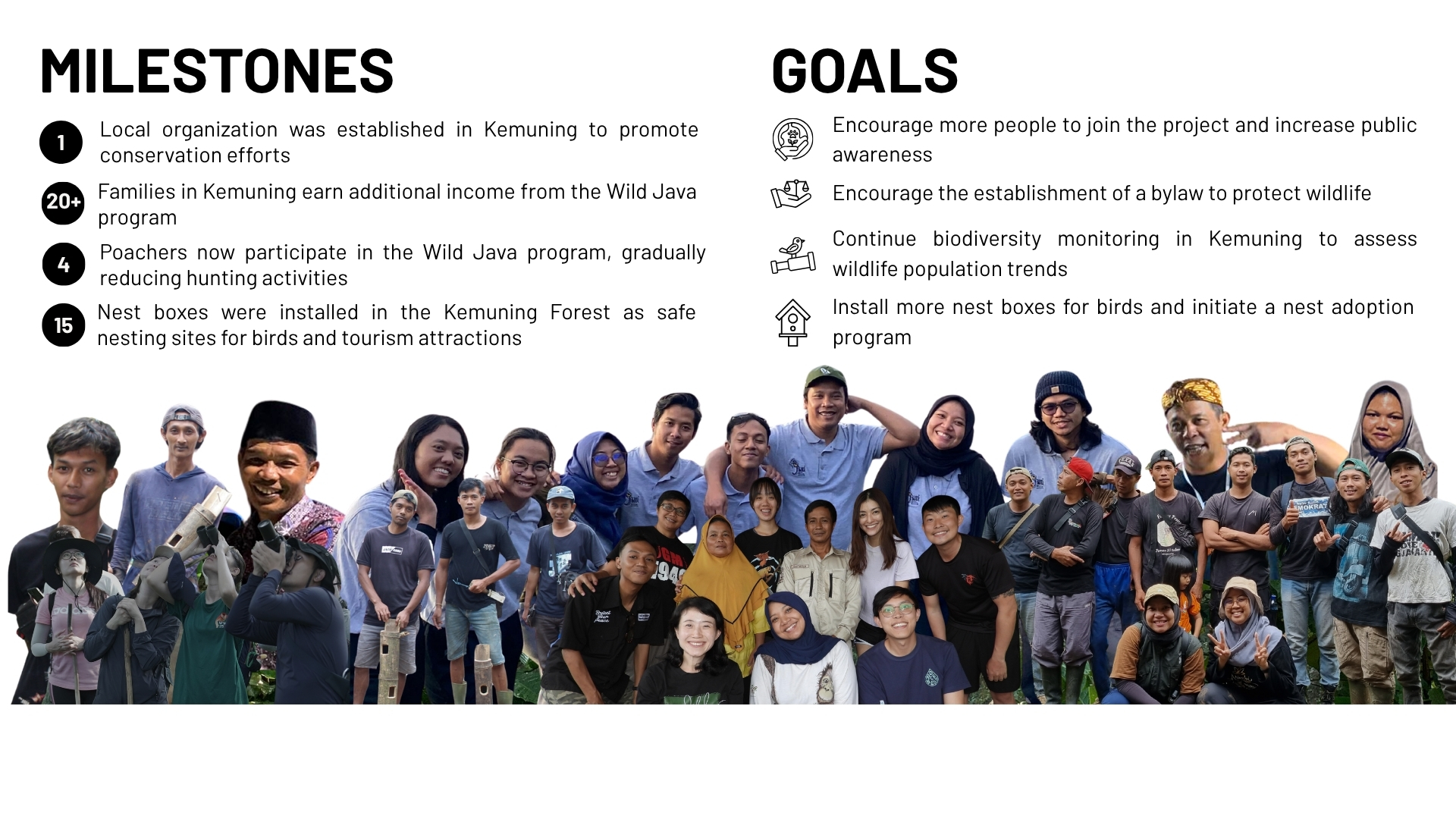 One of our tourism activities is Wild Java. Wild Java is a tourism program initiated by Javan Wildlife Institute (JAWI), Indonesia, and Wild Space, Singapore. We curate meaningful destinations around Yogyakarta and Temanggung, Indonesia, to expose participants to the reality that wildlife must remain free in their natural habitats. We take them to a wildlife trade market so they can witness firsthand how heartbreaking it is to see wild animals confined in small cages. Then, we bring them to Kemuning Forest, JAWI’s project site, to experience the beauty of one of the remaining tropical lowland forests in Java and to observe its wildlife. Participants engage in night observations to see nocturnal animals such as Javan slow lorises and in morning birdwatching activities to foster their appreciation for nature and wildlife.